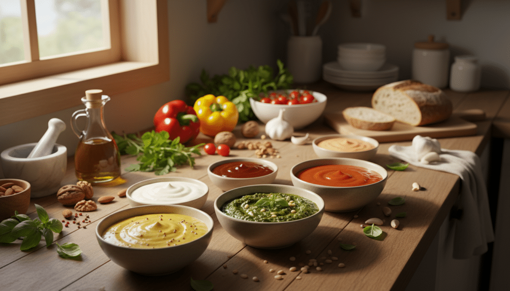- Geschmacksgeber: Zwiebeln, Knoblauch, Kräuter (frisch oder getrocknet), Gewürze, Zitronensaft, Essig, Senf, Tomatenmark und Sojasauce (Tamari für glutenfreie Varianten) verleihen den Saucen ihren Charakter.